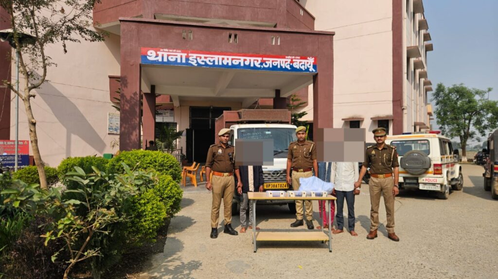 बदायूं। थाना इस्लामनगर पुलिस द्वारा मुखबिर की सूचना पर थाना इस्लामनगर क्षेत्रान्तर्गत चंदोई की मढेईया मोड़ से करीब 100 मीटर की दूरी पर ईदगाह की तरफ 03 शातिर अभियुक्तगण .सचिन निवासी ग्राम पुरा थाना बहजोई जिला संभल.विजयवीर नि0 ग्राम मझोला थाना बहजोई जिला संभल,. बबलू नि0 ग्राम मझोला थाना बहजोई जिला संभल को लूट की योजना बनाते हुये एक अदद छोटा हाथी ( इन्ट्रा पिकअप) दो तमंचे 315 बोर व दो अदद जिन्दा कारतूस 315 बोर नाजायज व एक अदद चाकू नाजायज व हथौड़ी,प्लास,पेचकस,छैनी व 09 नवम्बर को थाना उघैती क्षेत्र से चोरी हुये पाँच घन्टे पीली धातु(एक बडा , चार छोटे आकार के ) साथ गिरफ्तार किया ।