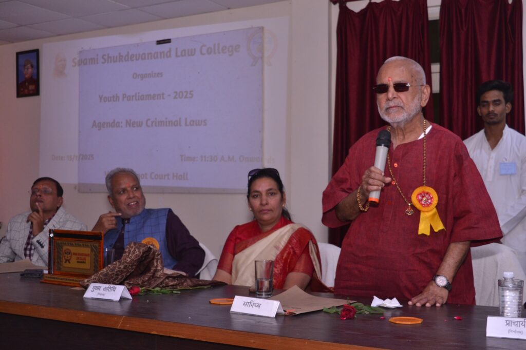 कार्यक्रम के अध्यक्ष परमपूज्य स्वामी चिन्मयानंद जी ने अपने उद्बोधन में कहा कि राष्ट्रहित सदैव व्यक्तिगत हित से ऊपर होता है। उन्होंने विद्यार्थियों को कर्तव्य-निष्ठा, अनुशासन, ऊर्जा के सकारात्मक उपयोग और राष्ट्र कल्याण हेतु समर्पित रहने का संदेश दिया। उन्होंने विधि-विधार्थियों की विशेष भूमिका पर प्रकाश डालते हुए कहा कि यदि युवा अपने कर्तव्यों को समझें और सही दिशा में कार्य करें, तो कोई भी लक्ष्य दूर नहीं। साथ ही उन्होंने स्वामी शुकदेवानंद विश्वविद्यालय की स्थापना हेतु मुख्यमंत्री योगी आदित्यनाथ जी और उत्तर प्रदेश सरकार के प्रति आभार व्यक्त किया। कार्यक्रम के दौरान प्रो. (डॉ.) अवनीश मिश्र द्वारा मुख्य अतिथि माननीय श्री मिथिलेश कुमार जी को अंगवस्त्र प्रदान कर सम्मानित किया गया। साथ ही क्लाइंट काउंसलिंग संहिता को सभी अतिथियों द्वारा हस्ताक्षरित कर औपचारिक रूप से अंगीकृत किया गया। यह संहिता महाविद्यालय के प्राध्यापक श्री प्रदीप कुमार सिंह व उनकी टीम द्वारा तैयार की गई है। मुख्य अतिथि माननीय श्री मिथिलेश कुमार जी ने अपने उद्बोधन में युवाओं को राष्ट्र का भविष्य करार देते हुए कहा कि आज के युवाओं की राजनीतिक समझ और जागरूकता भारत की लोकतांत्रिक व्यवस्था को सशक्त बना रही है। उन्होंने नई शिक्षा नीति, पर्यावरण संरक्षण, स्वास्थ्य जागरूकता, तथा गोबर आधारित जैविक खाद की महत्ता जैसे विषयों पर विशेष जोर दिया और प्रतिभागियों को संसदीय प्रणाली की गहन जानकारी प्रदान करते हुए लोकतांत्रिक मूल्यों को जीवन में आत्मसात करने की प्रेरणा दी। विशिष्ट अतिथि श्रीमती पुष्पा पांडे (सदस्य) उत्तर प्रदेश महिला आयोग ने युवाओं द्वारा प्रस्तुत पक्ष-विपक्ष के तर्कों की सराहना करते हुए कहा कि युवा संसद प्रतियोगिता के प्रतिभागियों को कानून और प्रणाली की जितनी जानकारी है, उतनी कुछ वास्तविक सांसदों को भी प्राप्त नहीं होती। उन्होंने महिला सशक्तीकरण पर जोर देते हुए कहा कि प्रतिभागियों में महिलाओं की उल्लेखनीय उपस्थिति यह प्रमाणित करती है कि आज की युवा महिलाएँ राजनीति में प्रवेश करने हेतु उत्साहित, सक्षम और अग्रसर हैं। कार्यक्रम के अंत में महाविद्यालय प्रबंध समिति के सचिव प्रो. अवनीश मिश्र ने आभार व्यक्त करते हुए कहा कि महाविद्यालय निरंतर नए आयाम स्थापित करता आ रहा है। आज जिला एवं सत्र न्यायाधीश द्वारा महाविद्यालय के विधिक सहायता केंद्र को अपनी गतिविधियों के लिए प्रथम स्थान प्राप्त होना इस संस्थान की गुणवत्ता, प्रतिबद्धता और सामाजिक उत्तरदायित्व का प्रमाण है। उन्होंने सभी अतिथियों, निर्णायकों, प्रतिभागियों, आयोजन समिति और छात्र-छात्राओं का हृदय से धन्यवाद ज्ञापित किया। अंत मे