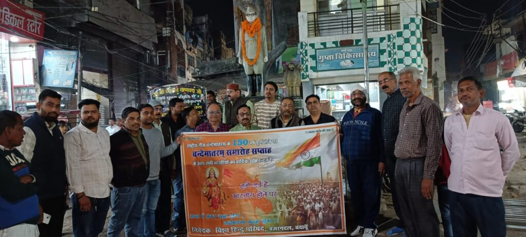 बदायूं। विश्व हिंदू परिषद ने वंदे मातरम समारोह सप्ताह के दूसरे दिन सुभाष चौक पर जिला अध्यक्ष नीरज रस्तोगी ने कार्यक्रम का प्रारंभ सुभाषचंद्र बोस की प्रतिमा पर पुष्प माला चढ़कर किया । जिला मंत्री उज्जवल गुप्ता ने बताया कि सभी कार्यकर्ताओं ने सामूहिक रूप से राष्ट्रगीत गाकर राष्ट्र निर्माण में योगदान देने का संकल्प लिया।कार्यक्रम का मुख्य उद्देश्य राष्ट्रगीत वंदे मातरम् के 150 वर्ष पूरे होने पर देशभक्ति और स्वदेशी की भावना को बढ़ावा देना था। इस मौके पर महेंद्रपाल सिंह,नीरज कोचर,अरविंद गुप्ता,राजेश सपरा,अमन साहू,ऋषि वर्मा,आमोद चाणक्य,रचित भारद्वाज,संजीव गुप्ता,मयूर गुप्ता,राजेंद्र भारद्वाज आदि लोग मजूद रहे l