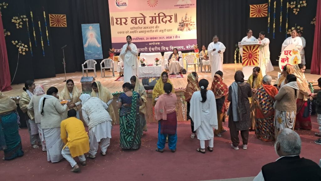 बरेली। जहां प्रेम है, अपनापन है, आपसी तालमेल, सहयोग और संवाद है वही घर है। जिस घर में पवित्र वातावरण है। आचरण शुद्ध है वह घर ही मंदिर होता है। दिव्यता का संचार ही घर को आश्रम या मंदिर बनाता है। जी आई सी ऑडोटोरियम मे ब्रह्माकुमारी संस्था के घर बने मंदिर कार्यक्रम में भीनमाल राजस्थान से आई गीता दीदी ने मुख्य वक्ता के रूप में बोलते हुए कहा कि पहले घर में सभी सदस्यों के बीच में आपस में बहुत स्नेह, अपनत्व और आदर था। हर कार्य में सुख दुख में सब साथ रहते थे। किसी को कोई समस्या होती थी सब साथ बैठ कर आराम से सुलझा लेते थे परन्तु आज का जीवन बिल्कुल अलग नजर आ रहा है। मोबाइल एवं टी वी सीरियल देख कर महिलाएं उस पात्र की झलक अपने में देख कर व्यर्थ में दुखी हो रही हैं । मोबाइल की गिरफ्त बच्चे आ गए हैं। बच्चे, युवा जीवन से थक रहे हैं। वह नशे के शिकार हो रहे हैं। परिवार टूट रहे हैं। संबंधों में कमी आ गई है। घर में घर का खाना नहीं खाना चाहते, सोच बदल गई है। आपस में विश्वास खत्म होता जा रहा है।