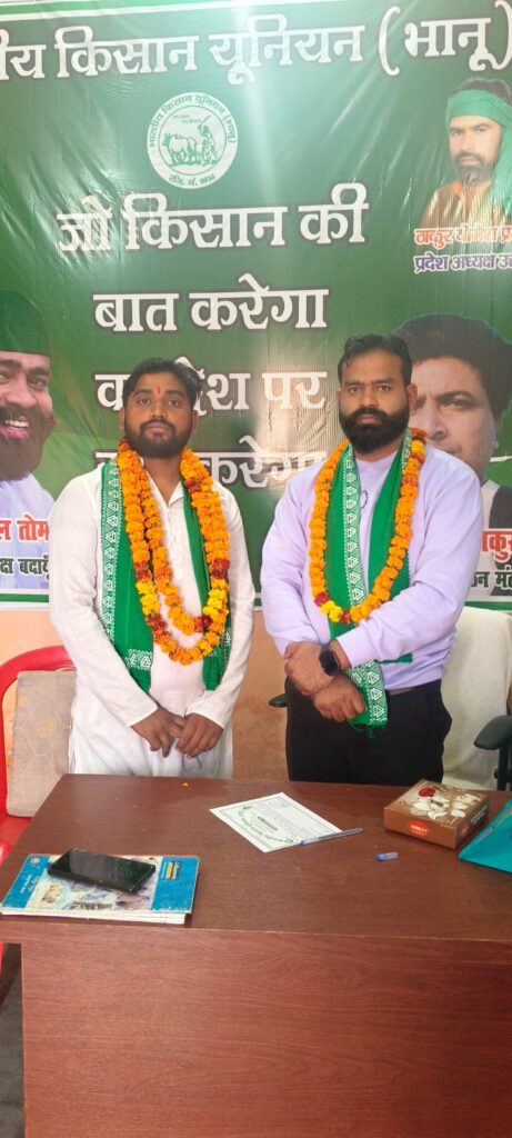 बदायूं। भारतीय किसान यूनियन भानू के जिला अध्यक्ष अतुल तोमर के द्वारा जनपद बदायूं में लगातार संघटन विस्तार किया जा रहा है उन्होंने कुमरगांव निवासी कैलाश शाक्य जो कि पूर्व में भाकियू भानू के सलारपुर ब्लॉक उपाध्यक्ष पद पर थे पदोन्नति करते हुए उनको जिला अध्यक्ष युवा मोर्चा बदायूं पद पर आज मनोनीत किया गया जिला अध्यक्ष अतुल तोमर ने बताया कि जनपद बदायूं में संघटन बहुत तेजी से विस्तार कर रहा है उसका मात्र ये कारण है कि जिला कार्यालय उझानी पर जनसुनवाई के दौरान पीड़ित किसान गरीब मजदूरों को न्याय मिल रहा है और किसानों का अब विश्वास भारतीय किसान यूनियन भानू पर बढ़ रहा है ।