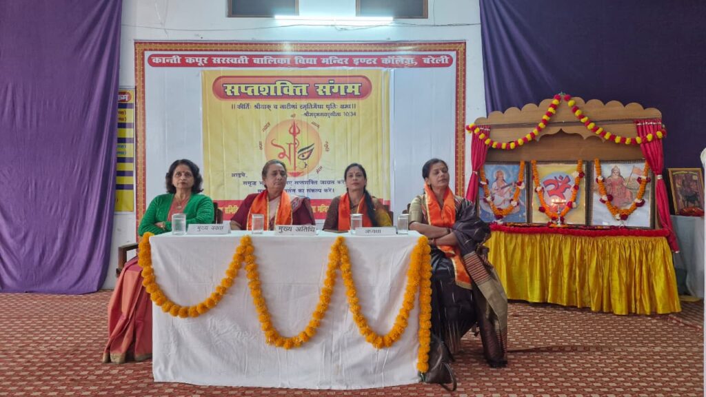 बरेली । विद्या भारती द्वारा आयोजित कांति कपूर सरस्वती बालिका विद्या मंदिर इंटर कॉलेज में सप्त शक्ति संगम कार्यक्रम का शुभारंभ मां सरस्वती के समक्ष दीप प्रज्वलन एवं पुष्पार्चन मुख्य अतिथि प्रोफेसर अजिता सिंह तिवारी बरेली कॉलेज बरेली, मुख्य वक्ता सुश्री रेखा चूड़ासमा अखिल भारतीय संयोजका सप्तशक्ति संगम कार्यक्रम अध्यक्षा डॉ नीलम गुप्ता प्रोफेसर बरेली कॉलेज बरेली ने कर कार्यक्रम का शुभारंभ किया।विद्यालय की प्रबन्धिका श्रीमती सरोज अग्रवाल एवं प्रधानाचार्या श्रीमती अर्चना जी ने सभी अभिभाविकाओं एवं अतिथियों का स्वागत किया।