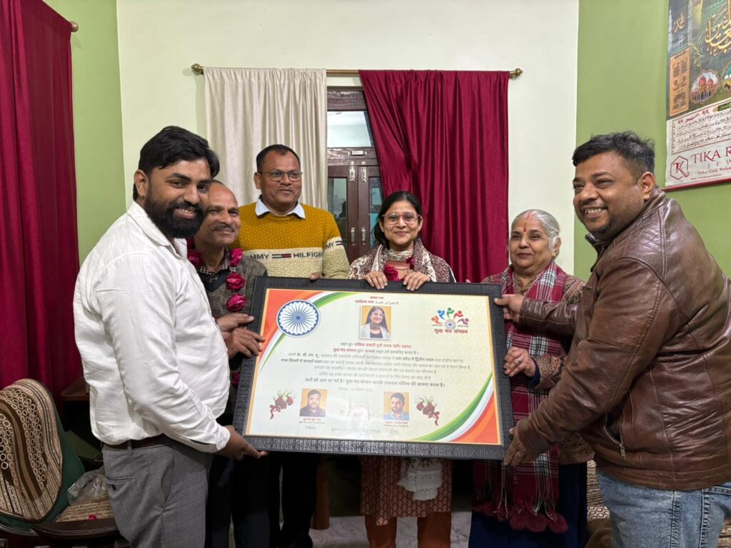 उसहैत। युवा मंच संगठन की मार्गदर्शिका, वरिष्ठ समाजसेविका आशा गुप्ता ने राबिया अंसारी को सम्मानित किया।