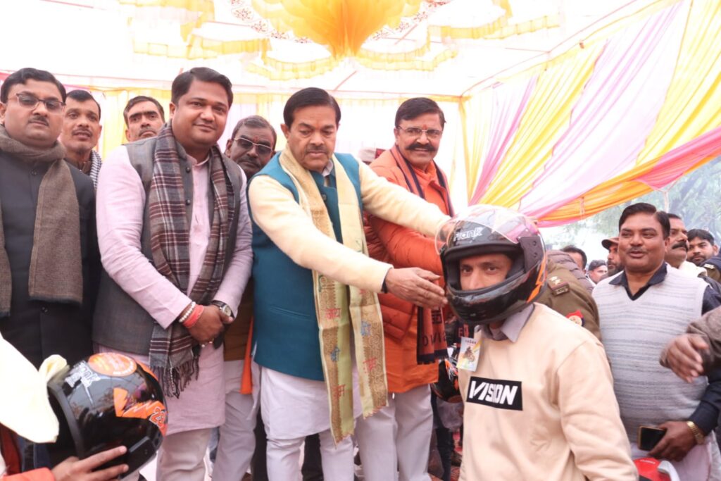 इसलिए मैं वी एल वर्मा जी का ह्रदय से अभिनन्दन करता हूँ सदर विधायक महेश चंद्र गुप्ता ने कहा कि जिस दिन से मैं विधायक बना हूं लगातार मैं इस क्षेत्र की मां के रूप में सेवा कर रहा हूं मेरी विधानसभा क्षेत्र में खुशहाली रहे,लोगो की तरक़्क़ी हो क्षेत्र का विकास हो इसके लिए मैं लगातार काम करता हूं उन्होंने मोटरसाइकिल वाले लोगों को पुनः संकल्प दिलाया कि हम यह संकल्प ले कि जब भी घर से बाहर जाएंगे बिना हेलमेट के नहीं जाएंगे जिससे सड़क दुर्घटना में किसी की अनहोनी ना हो उन्होंने मातृशक्ति से भी आवाहन किया की जब भी उनके घर का कोई मोटरसाइकिल से बाहर जाए तो उसके लिए हेलमेट लगाने के लिए अवस्य कहे। अंत मे सैकड़ो लोगो की हेलमेट वितरित किये गए। कार्यक्रम का संचालन जिला महामंत्री सुधिर श्रीवास्तव ने किया कार्यक्रम में जिला उपाध्यक्ष सोवरन सिंह राजपूत, युवा नेता विश्वजीत गुप्त,ब्लाक प्रमुख पति अनेकपाल पटेल,अंकित मौर्य, धीरेंद्र सिंह,रामचरण पाल,संदीप सिंह, सुखेंद्र सिंह, प्रधान वीर सिंह, ऋषिपाल सिंह, सत्यवीर सिंह पंकज गुप्ता, संजीव गुप्ता, खयाली राम मौर्य, सोनू सिंह, सहित सैकड़ो लोग उपस्थित रहे।