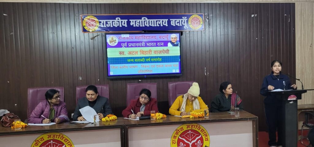 बदायूँ। आवास विकास स्थित राजकीय महाविद्यालय में अटल बिहारी वाजपेयी जन्मशताब्दी समारोह के अंतर्गत जिला स्तरीय भाषण, निबन्ध एवं एकल काव्य पाठ प्रतियोगिता का आयोजन किया गया। कार्यक्रम की अध्यक्षता प्राचार्य डॉ श्रद्धा गुप्ता तथा संचालन डॉ राकेश कुमार जायसवाल ने किया । उदघाटन मुख्य अतिथि राजकीय महिला महाविद्यालय की प्राचार्य डॉ वन्दना ने दीप प्रज्वलित कर किया।