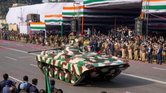 इस बार हथियारों को वास्तविक युद्ध क्रम में पेश करने वाला बैटर एरे फॉर्मेट पहली बार देखने को मिला। परेड में स्वदेशी ध्रुव हेलीकॉप्टर, रुद्र प्रहार, भीष्म और अर्जुन टैंक, धनुष गन सिस्टम, अमोघ और आकाश मिसाइल प्रणाली ने मेक इन इंडिया की मजबूती को दर्शाया।