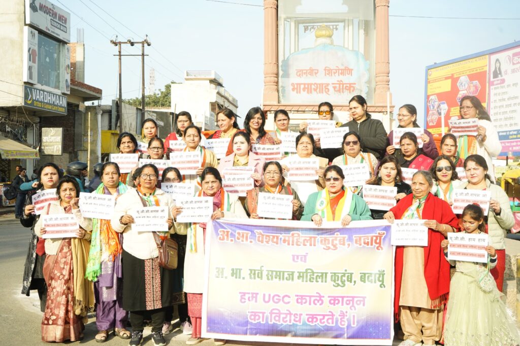 बदायूँ। अखिल भारतीय .वैश्य महिला कुटुंब एवं अखिल भारतीय सर्व समाज महिला कुटुंब की संस्थापिका डॉ प्रतिभा गुप्ता एड. के नेतृत्व में भामाशाह चौक पर यूजीसी एक्ट 2026 के विरोध में सांकेतिक धरना प्रदर्शन कर अपना विरोध व्यक्त किया गया। डॉ प्रतिभा गुप्ता ने सांकेतिक धरने के दौरान कहा कि हम अपनी सभी सखियों के साथ आज यहां एक महत्वपूर्ण विषय UGC 2026 के विरोध में अपनी आवाज उठाने के लिए एकत्रित हुए हैं।