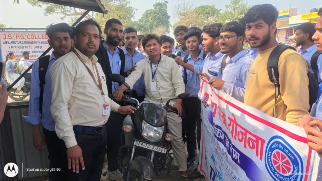 बदायूँ। जे.एस. (पी.जी.) कॉलेज में राष्ट्रीय सेवा योजना (NSS) के सात दिवसीय विशेष शिविर के चतुर्थ दिवस पर एनएसएस की दोनों इकाइयों द्वारा संयुक्त रूप से “यातायात जागरूकता अभियान” का आयोजन किया गया।