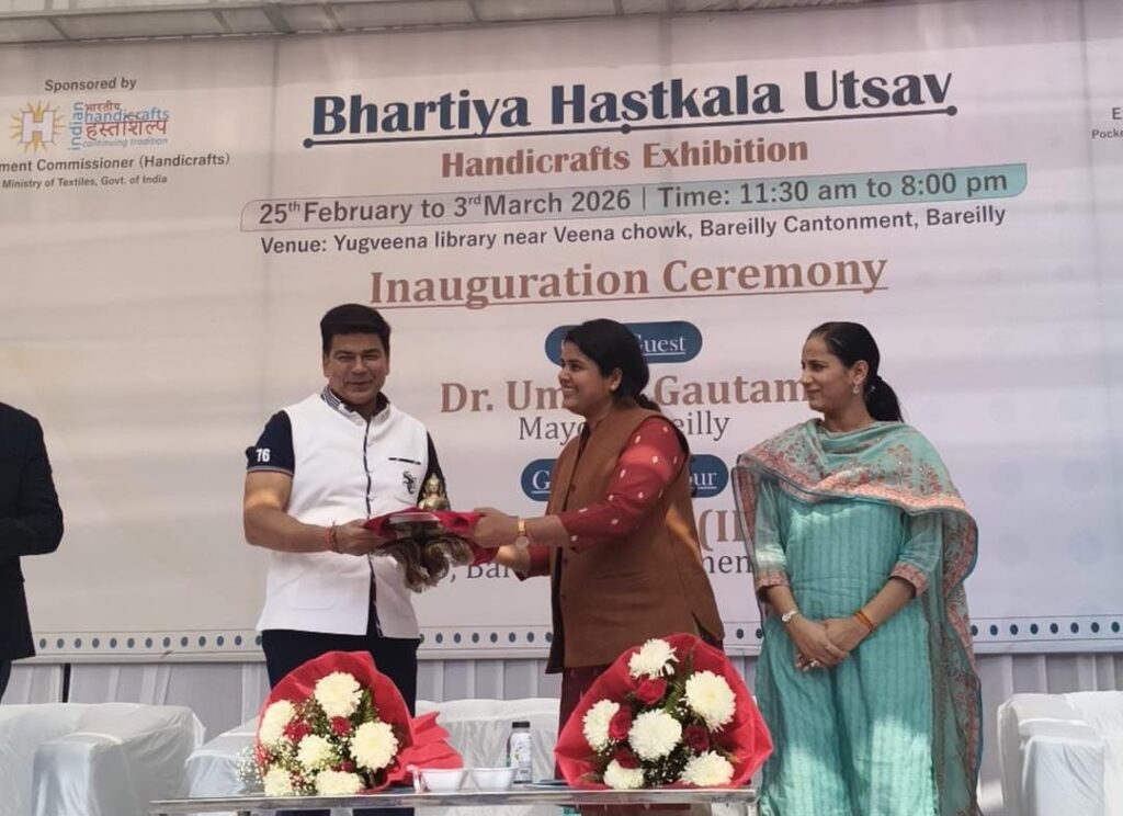 बरेली। छावनी परिषद द्वारा आयोजित भारतीय हस्तकला उत्सव के अंतर्गत हैंडीक्राफ्ट प्रदर्शनी का भव्य शुभारंभ महापौर डॉ. उमेश गौतम के कर-कमलों द्वारा गरिमामयी वातावरण में संपन्न हुआ। कार्यक्रम का आयोजन छावनी परिषद की मुख्य कार्यकारी अधिकारी डॉ. तनु जैन के निर्देशन में किया गया। प्रदर्शनी में देश के विभिन्न राज्यों से आए कारीगरों ने अपनी पारंपरिक कला और हस्तशिल्प का आकर्षक प्रदर्शन किया। स्टॉलों पर हस्तनिर्मित सजावटी वस्तुएँ, घरेलू उपयोग के उत्पाद, पारंपरिक कलाकृतियाँ और विविध शिल्प सामग्री ने आगंतुकों का ध्यान आकर्षित किया। आयोजन का उद्देश्य स्थानीय कारीगरों को मंच प्रदान करना तथा नागरिकों को भारतीय हस्तकला की समृद्ध परंपरा से जोड़ना रहा।