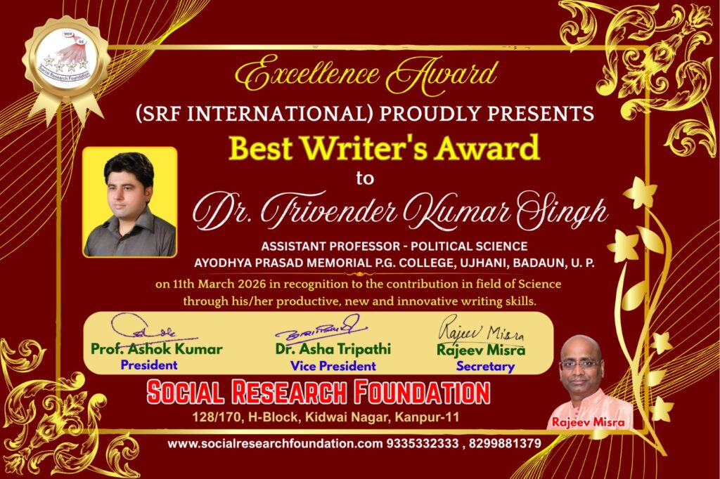 उझानी । ए.पी.एम.( पी.जी) कॉलेज, उझानी बदायूं के राजनीति विज्ञान विभाग के विभागाध्यक्ष एवं महाविद्यालय के चीफ प्रॉक्टर डॉ. त्रिवेन्द्र कुमार सिंह को सोशल रिसर्च फाउंडेशन कानपुर ने महिला दिवस के अवसर पर आयोजित राष्ट्रीय संगोष्ठी तथा सम्मान समारोह में विज्ञान और साहित्य के क्षेत्र में अतुलनीय योगदान के लिए सर्वश्रेष्ठ लेखक के पुरस्कार से सम्मानित किया ।राष्ट्रीय संगोष्ठी का मुख्य विषय बदलता समाज और महिलाओं की भूमिका रहा।