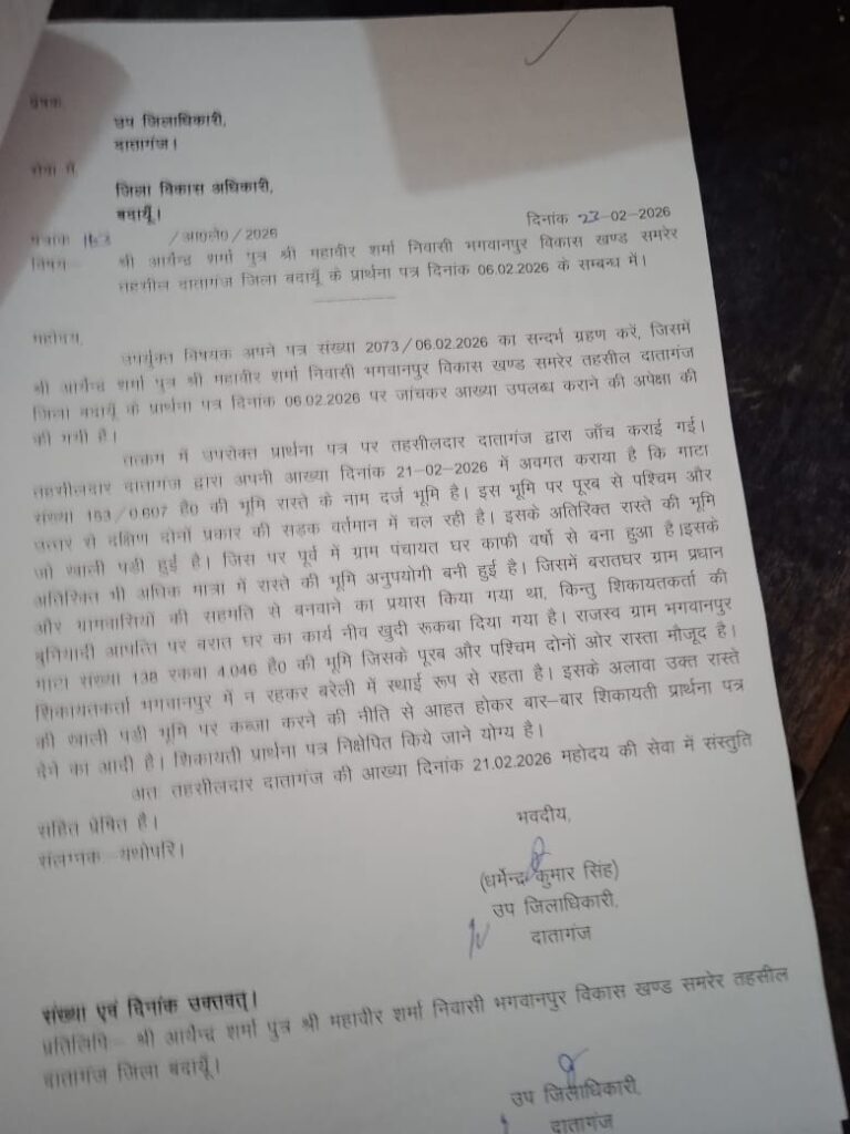 दातागंज। तहसील के ग्राम भगवानपुर में राजस्व अभिलेखों में श्रेणी-6 (रास्ता) दर्ज गाटा संख्या-153 (रकबा 0.6070 हेक्टेयर) पर बारात घर का निर्माण कार्य विवादों में घिर गया है। ग्रामीणों का आरोप है कि सार्वजनिक उपयोग की इस भूमि पर पक्का निर्माण कराना उत्तर प्रदेश राजस्व संहिता-2006 के प्रावधानों का सीधा उल्लंघन है, लेकिन स्थानीय प्रशासन ने बार-बार शिकायतों के बावजूद न तो निर्माण रोका और न ही दोषियों पर कार्रवाई की।प्राप्त दस्तावेज़ों के अनुसार, प्रार्थी ने पहले स्थानीय स्तर पर कई शिकायती पत्र दिए। जब कोई कार्रवाई नहीं हुई तो आईजीआरएस (जनसुनवाई) पोर्टल पर दो अलग-अलग संदर्भों—संख्या 9251490005879 (दिनांक 07.01.2026) तथा संख्या 50014926000004—के तहत शिकायत दर्ज कराई गई।शिकायतकर्ता का दावा है कि दोनों शिकायतों का निस्तारण “गलत तथा भ्रामक” तरीके से किया गया। निस्तारण आख्या में उप जिलाधिकारी (एसडीएम), दातागंज ने स्वयं स्वीकार किया कि श्रेणी-6 रास्ता की भूमि पर बारात घर का निर्माण ग्राम पंचायत के प्रस्ताव के आधार पर किया जा रहा है, लेकिन उसी आख्या में प्रार्थना पत्र को “झूठा तथा निराधार” बताकर खारिज कर दिया गया और किसी भी कार्रवाई से इनकार कर दिया गया।