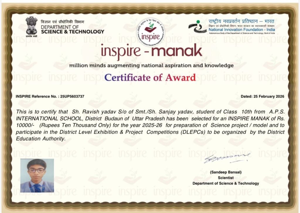 उझानी। ए.पी.एस. इंटरनेशनल स्कूल के विद्यार्थियों ने विज्ञान के क्षेत्र में उत्कृष्ट प्रदर्शन करते हुए इंस्पायर मानक पुरस्कार हासिल कर विद्यालय और क्षेत्र का नाम रोशन किया है।विद्यालय के छात्र रविश यादव (कक्षा 11) और पराग पुष्प (कक्षा 10) का चयन जिला स्तर पर हुआ, जिसके तहत दोनों को केंद्र सरकार द्वारा 10-10 हजार रुपये की प्रोत्साहन राशि प्रदान की गई है। यह धनराशि उन्हें अपने वैज्ञानिक मॉडल विकसित करने के लिए दी गई है।विद्यार्थियों के प्रोजेक्ट भी बेहद नवाचारी रहे रविश यादव:एडवांस नेल ट्रिमिंग डिवाइसपराग पुष्प:मेडी स्नेप – सिक्योर ओपनर फॉर वैक्सीन ग्लास ट्यूबयह पुरस्कार विज्ञान एवं प्रौद्योगिकी विभाग, भारत सरकार द्वारा नवप्रवर्तन को बढ़ावा देने के उद्देश्य से दिया जाता है।अटल टिंकरिंग लैब के इंचार्ज विपिन आनंद ने दोनों विद्यार्थियों को इस उपलब्धि पर बधाई देते हुए उनके उज्ज्वल भविष्य की कामना की। वहीं विद्यालय के प्रबंधक और प्रधानाचार्य ने भी छात्रों की सफलता पर हर्ष व्यक्त करते हुए कहा कि यह उपलब्धि अन्य विद्यार्थियों के लिए प्रेरणा का स्रोत बनेगी।