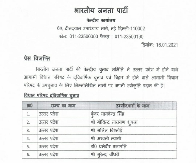 लखनऊ। भारतीय जनता पार्टी ने उत्तर प्रदेश विधान मंडल के उच्च सदन में भी अपनी ताकत में इजाफा करने का पूरा मन बना लिया है। प्रदेश में 28 जनवरी को होने वाले विधान परिषद के चुनाव में भारतीय जनता पार्टी दस प्रत्याशी उतार रही है। भारतीय जनता पार्टी के राष्ट्रीय महासचिव तथा केंद्रीय कार्यालय प्रभारी अरुण सिंह ने शनिवार को छह और नाम की सूची जारी की। इसमें कानपुर के कद्दावर नेता सलिल विश्नोई का भी नाम है। भाजपा ने शनिवार को जो सूची जारी की है, उसमें प्रदेश महामंत्री गोविंद नारायण शुक्ला, कुंवर मानवेंद्र सिंह, सलिल विश्नोई, अश्वनी त्यागी, डॉ. धर्मवीर प्रजापति तथा सुरेंद्र चौधरी को प्रत्याशी बनाया है। गोविंद नारायण शुक्ल भाजपा के प्रदेश संगठन में कार्य कर रहे हैं और उनको सदन में भेजे जाने की लंबे समय से चर्चा की जा रही थी।