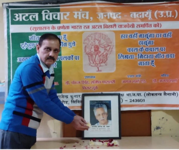 बदायूँ। अटल विचार मंच ने संस्कार भारती के संस्थापक राष्ट्रीय संरक्षक पद्मश्री बाबा योगेंद्र जी की 100 बी जयंती मनाई। मंच के सचिव अजय शर्मा ने बताया कि बाबा का जन्म 7 जनवरी 1924 को बस्ती जिले में हुआ था 1981 में उन्होंने संस्कार भारती की स्थापना की उन्होंने ख्याति प्राप्त अनाम प्रतिभओ और कलाकारों को संस्कार भारती के द्वारा मंच प्रदान किया प्रदान किया वह राष्ट्रीय स्वयंसेवक संघ के वरिष्ठ प्रचारक थे इस अवसर पर डॉक्टर पंकज सिंह रविंद्र नाथ जौहरी एडवोकेट महेंद्र पाल सिंह ऋषिपाल सिंह संजीव पाराशरी अमन शर्मा एडवोकेट रंजना रानी आदि कला साधक कार्यकर्ता उपस्थित थे