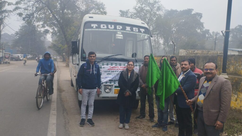 बदायूँ। सोमवार को राष्ट्रीय कृषि और ग्रामीण विकास बैंक (नाबार्ड) द्वारा प्रायोजित कैट योजना के अंतर्गत नाबार्ड ने बदायूं जिले के 25 किसानों का एक दल आईसीएआर- भारतीय गन्ना अनुसंधान संस्थान, लखनऊ के लिए तीन दिवसीय प्रशिक्षण और भ्रमण के लिए बदायूं जिले के परियोजना निदेशक (डी.आर.डी.ए.) बलराम कुमार द्वारा हरी झंडी दिखाकर रवाना किया। नाबार्ड हमेशा से ग्रामीण विकास के लिए प्रयासरत रहता है और उसके तहत ग्रामीण क्षेत्रों में कृषक उत्पादक संगठनों का विकास किया जा रहा है। इन किसानों का चयन मुख्यतः नाबार्ड द्वारा वित्तपोषित कृषक उत्पादक संगठनों से किया गया है नाबार्ड के जिला विकास प्रबंधक ललित मौर्य ने बताया कि इस 3 दिवसीय प्रशिक्षण और भ्रमण कार्यक्रम के माध्यम गन्ना उत्पादन से जुड़े किसानों को नवीनतम तकनीकी, फसल रखरखाव तथा गन्ने का प्रसंस्करण करके विभिन्न उत्पाद बनाने की जानकारी प्राप्त होगी। इसके अलावा गन्ने की उन्नत क़िस्मों तथा गन्ने का बीज उत्पादन की आदि से जुड़ी नवीनतम जानकारी भी मिलेगी, जो उन्हें अपने व्यावसायिक जीवन में उपयोग करने में सहायता करेगी। इस अवसर पर अग्रणी बैंक प्रबंधक रिकेश रंजन और आयोजक संस्था ट्रू विजन वेल्फाइयर सोसाइटी की अध्यक्ष, सुबूही जहेरा जैदी एवं प्रबन्धक, विवेक राठौर इस कार्यक्रम कार्यक्रम में मौजुद रहे।