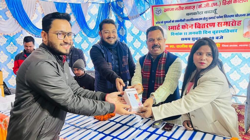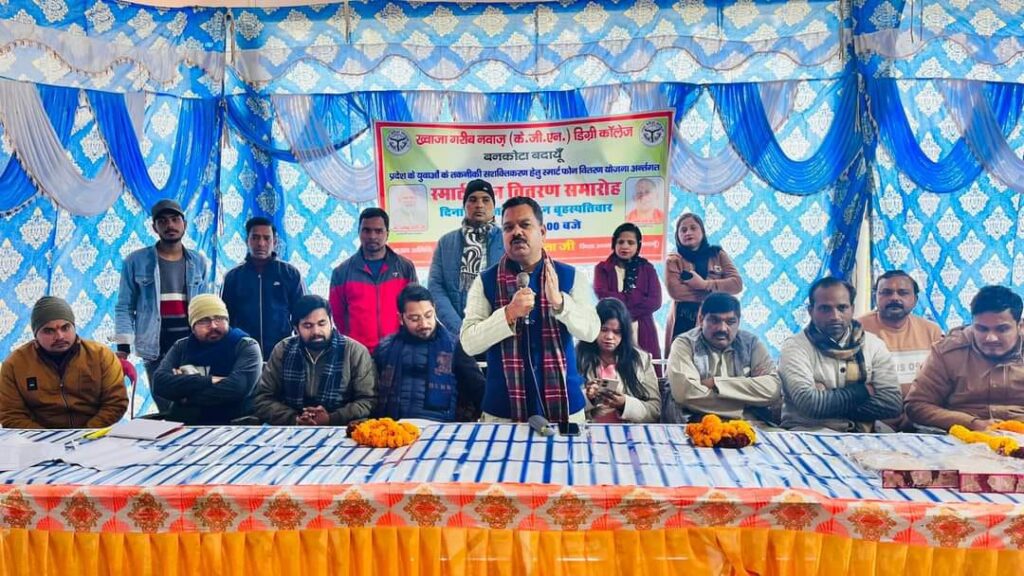 बदायूँ । ख्वाजा गरीब नवाज़ (के.जी.एन) डिग्री कॉलेज बनकोटा में स्वामी विवेकानन्द युवा सशक्तिकरण योजना के अंतर्गत स्मार्ट फोन वितरण कार्यक्रम में डिग्री कॉलेज में 71 छात्र व छात्राओं को स्मार्ट फोन वितरण किया।जिलाध्यक्ष राजीव कुमार गुप्ता ने कहा प्रधानमंत्री नरेंद्र मोदी ने विश्व में भारत को अलग पहचान दिलाई है।