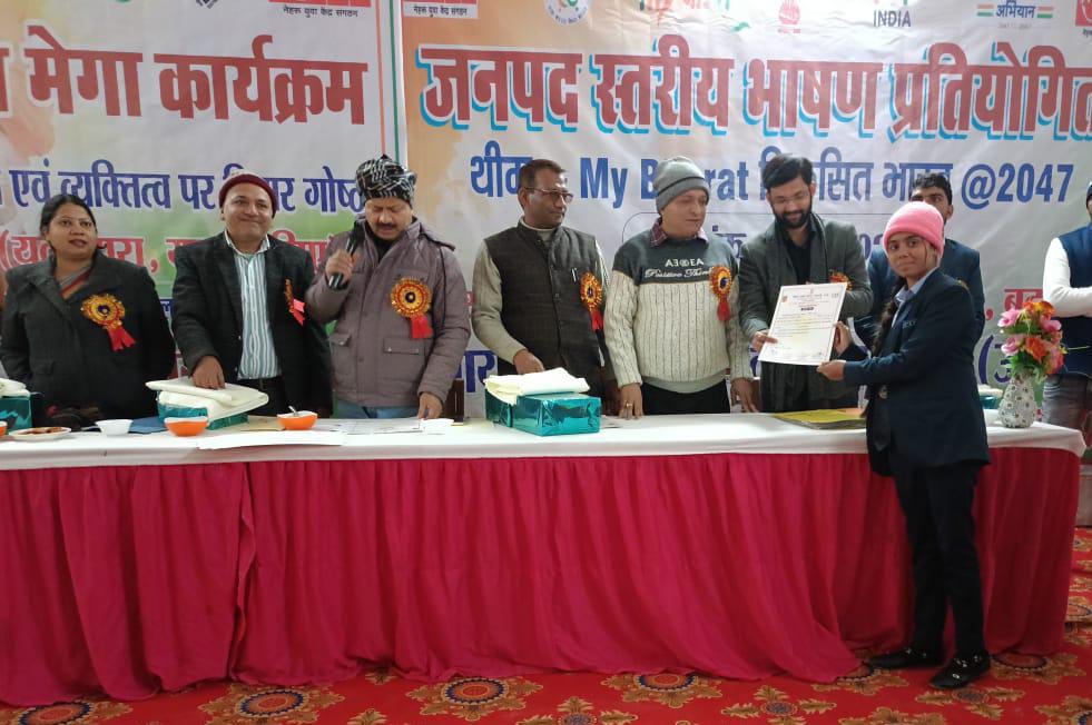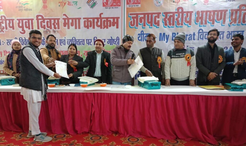 ज़िला स्तरीय भाषण प्रतियोगिता में जिले के विभिन्न महाविद्यालयो से आए हुए युवाओं ने प्रतिभाग किया तथा बताया कि मेरा भारत 2047 तक विकसित राष्ट्र का स्वरूप ग्रहण कर लेगा । युवाओं के प्रेरणा स्रोत स्वामी विवेकानंद जी के विचारों MY भारत विकसित भारत @2047 को साझा किया गया ।