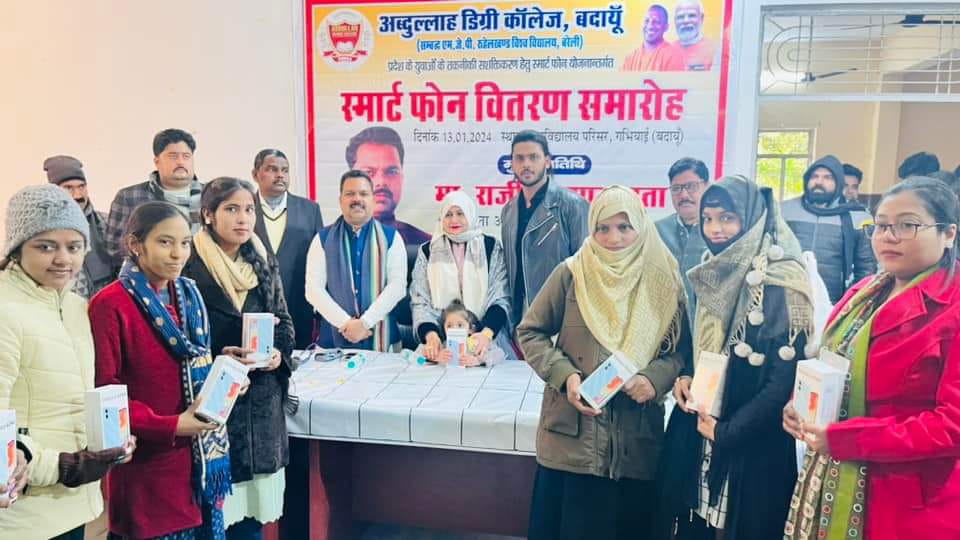 बदायूँ। अब्दुल्ला डिग्री कॉलेज परिसर में स्वामी विवेकानंद युवा सशक्तिकरण योजना के अंतर्गत समार्ट फ़ोन वितरण कार्यक्रम में जिलाध्यक्ष राजीव कुमार गुप्ता ने डिग्री कॉलेज में छात्र व छात्राओं को 92 स्मार्ट फ़ोन वितरण किए। जिलाध्यक्ष राजीव कुमार गुप्ता ने कहा भाजपा सरकार की विभिन्न तरह के महत्वकांक्षी योजनाएं चलाई जा रही हैं, जिनसे न सिर्फ गरीब और असहाय व्यक्तियों का हित समाहित है, बल्कि कुछ योजनाएं समाज के दृष्टिकोण से भी महत्वपूर्ण है। गरीबों के साथ-साथ देश के युवाओं को साथ लेकर चलने वाली मोदी-योगी सरकार युवाओं के लिए भी विभिन्न तरह की योजनाएं शुरू कर चुकी है, जिससे ना सिर्फ युवाओं का मनोबल बढ़ाया जा सके बल्कि उन्हें आगे बढ़ने की प्रेरणा भी दी जा सके।