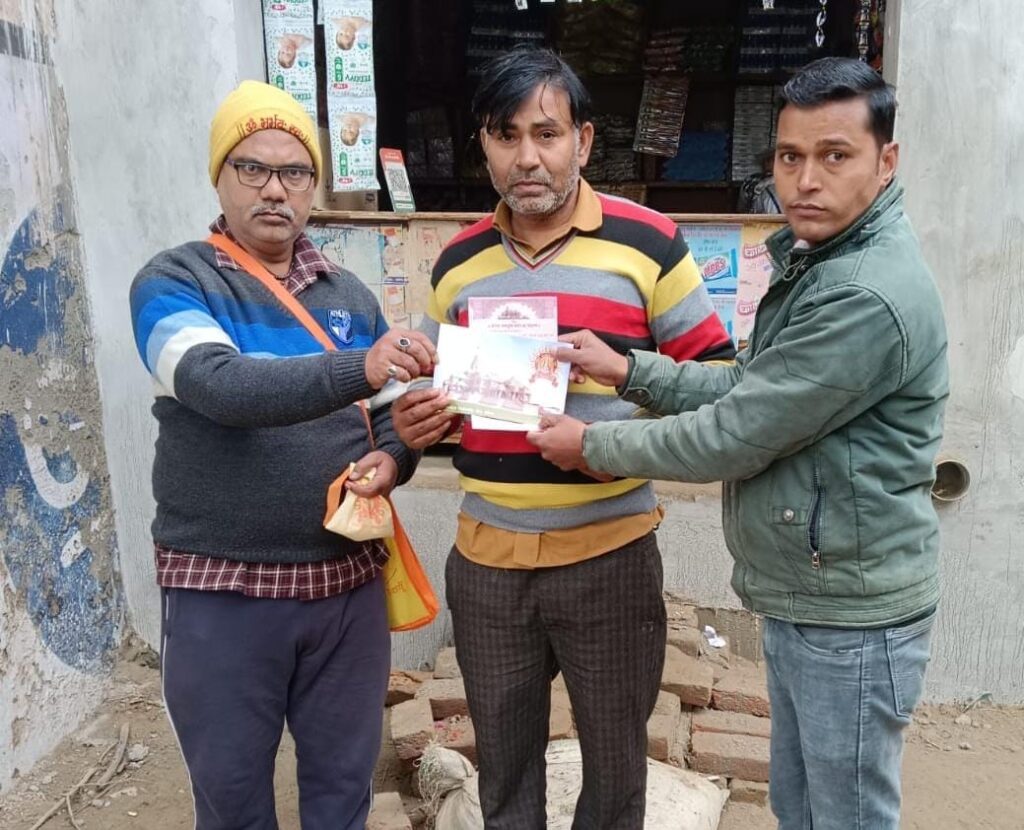 जहां इस मौके पर नगर संघ चालक शेष माहेश्वरी, तरुण सक्सेना, हरवीरआदि ने घर घर जाकर अयोध्या के राम मंदिर में राम लला की प्राण प्रतिष्ठा का न्योता दिया है।। रिपोर्ट अनुज रस्तोगी कुंवरगांव