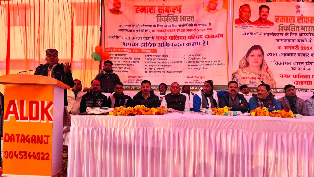 इस तरह जगह जगह हुए विकसित भारत संकल्प यात्रा के कार्यक्रम ब्लॉक व नगर पंचायत गुलड़िया में पूर्व विधायक धर्मेन्द्र शाक्य, ब्लॉक सहसवान के खुण्डआ व शरह बघंली गांव में पूर्व जिला पंचायत अध्यक्षा पूनम यादव, ब्लॉक दहगवां के सिरसा खुर्द गांव में सुभाष चंद्र गुप्ता, ब्लॉक आसफपुर के पिपरिया व मोहकमपुर गांव में सोवरन सिंह राजपूत, ब्लॉक सहसवान के मेवली गांव में नेकपाल कश्यप, ब्लॉक आसफपुर के निजामुद्दीनपुर शाह व पूर्वा खेड़ा गांव में हरिओम पाराशरी, नगर पालिका दातागंज में शैलेश पाठक, ब्लॉक सहसवान के राज बिरौलिया गांव में राजेश्वर सिंह पटेल, ब्लॉक इस्लामनगर के माईकला व मोजद्दीन नगर गांव में गजेंद्र यादव, ब्लॉक कादरचौक के मुगर्रा टटेई व नूरपुर गांव में कीर्ति कश्यप, ब्लॉक दहगवां के कमालपुर जुल्लनगर सुभाष गौड़, ब्लॉक दहगवां के शादीपुर गांव में सलमान हैदर नकवी, दुर्गेश वार्ष्णेय, मेधावी यादव, विक्रांत यादव, अमित पाठक, वीरेन्द्र राजपूत, ओम कृष्ण सागर, अनुपम पाठक, नैना गुप्ता, तारा देवी, महेश शाक्य, दीक्षा माहेश्वरी, गोविंद स्वरूप पाठक, प्रदीप चौधरी, पुरषोत्तम टाटा, मुनीश पंडित, अरशद अल्वी, अनुज माहेश्वरी, आकाश वर्मा, अरविंद शर्मा, अजय पाराशरी, विनोद शर्मा आदि जनप्रतिनिधि व कार्यकर्ता उपस्थित रहे।