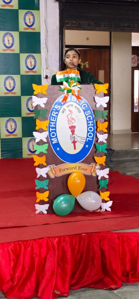 जिसमें उन्होंने बताया कि 26 जनवरी 1950 को भारत का संविधान लागू लागू किया गया था। संविधान के बिना कोई देश नहीं चल सकता। संविधान लागू होने के बाद हमारा देश भारत एक गणतंत्र देश बन गया। इसके बाद कक्षा 9 की छात्राओं द्वारा देशभक्ति पर मनमोहक नृत्य प्रस्तुत किया गया। कार्यक्रम के अंत में स्कूल के प्रबन्धक राजेश यादव एवम प्रधानाचार्या शीबा खान ने सभी को गणतंत्र दिवस की शुभकामनाएं दी ,और बताया कि भारतीय संविधान 26 जनवरी 1950 को लागू हुआ था तब से हम सब इस दिन को गणतंत्र दिवस के रूप में मनाते हैं जब हमारा देश आजाद हुआ उस समय भारत के पास अपना कोई संविधान नहीं था