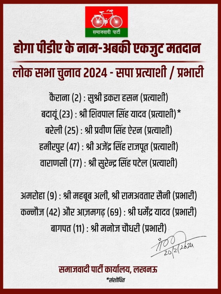 लखनऊ। आगामी लोकसभा चुनाव के मद्देनजर समाजावारी पार्टी ने उत्तर प्रदेश की पांच और सीटों पर उम्मीदवारों का एलान कर दिया है। सूची में सपा मुखिया अखिलेश यादव ने चाचा शिवपाल यादव को बदायूं से उम्मीदवार घोषित किया है। इससे पहले यहां से अखिलेश के चचेरे भाई धर्मेंद्र यादव चुनाव लड़ चुके हैं। वहीं पार्टी ने वाराणसी से सुरेंद्र सिंह पटेल को टिकट दिया है, जबकि इस सीट पर मौजूदा सांसद प्रधानमंत्री नरेंद्र मोदी हैं। अगर प्रधानमंत्री इसी सीट से एक बार फिर चुनाव लड़ते हैं तो उन्हें यहां सुरेंद्र सिंह पटेल टक्कर देते हुए नजर आएंगे। कैराना से इकरा हसन बदायूं से शिवपाल यादव हमीरपुर से अजेंद्र सिंह राजपूत वाराणसी से सुरेंद्र सिंह पटेल
