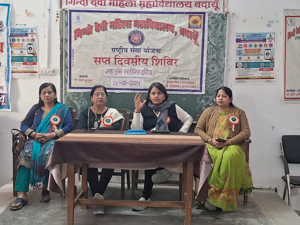 अपर जिला जज सारिका गोयल द्वारा छात्राओं को शिविर के तृतीय दिन नशा मुक्ति एवं डिजिटल भारत और छात्रों को संबोधित करते हुए कहा कि आज का युवा मोबाइल की लत का शिकार है अधिकांश समय अपना रील बनाने में व्यस्त है मोबाइल का उपयोग गलत दिशा में कर रहा है ,युवा को अपने भविष्य को लेकर सतर्क रहना आवश्यक है। शिविर में बदायूं जिले के फिजियोथैरेपिस्ट डॉ इमरान ने बताया कि किस प्रकार हम योग एवं व्यायाम द्वारा अपने इंद्रियों को वश में करके अपने आप को नियंत्रित किया जा सकता है। प्राचार्या महोदया ने कहा समाज में नशे की बीमारी एवं लत को जड़ से समाप्त करने के उद्देश्य से सामाजिक न्याय एवं अधिकारिता विभाग द्वारा नशा मुक्त भारत अभियान का शुभारम्भ किया गया है।