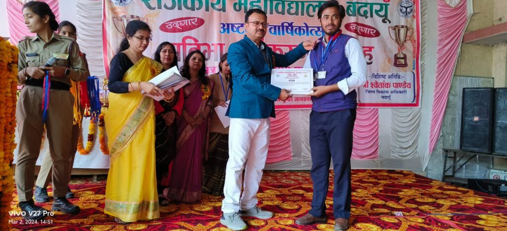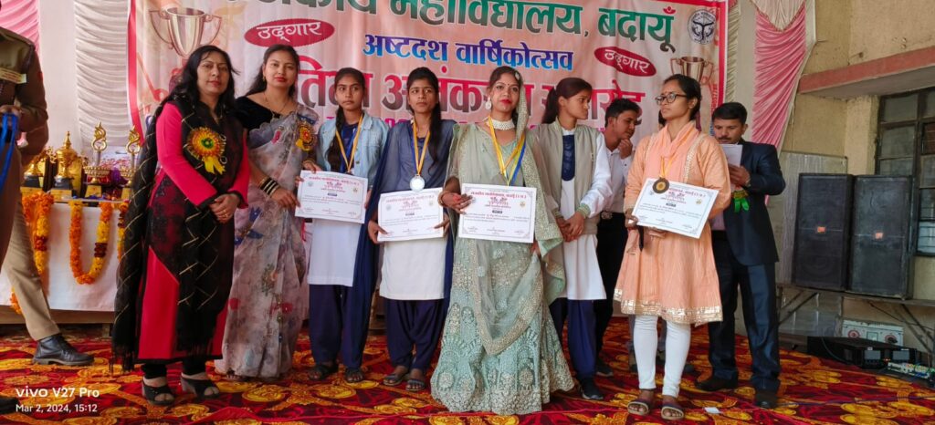बदायूँ। आवास विकास स्थित राजकीय महाविद्यालय में सत्र 2022-23 एवम 2023 – 24 का प्रतिभा अलंकरण समारोह एवं अष्टदश वार्षिकोत्सव धूमधाम से संपन्न हुआ। कार्यक्रम का उद्घाटन प्राचार्य डॉ श्रद्धा गुप्ता ने मां सरस्वती की प्रतिमा के समक्ष दीप प्रज्वलित कर किया। सरस्वती वंदना सेजल मिश्रा ने प्रस्तुत किया। भूमि मिश्रा की टोली ने स्वागत गान प्रस्तुत किया। कुलगीत सेजल ने गाया। महाविद्यालय की वर्ष भर की उपलब्धियों की आख्या डॉ अनिल कुमार ने सबके समक्ष रखा। सांस्कृतिक कार्यक्रम में छाया और रोहित गीत गाकर सभी को मंत्रमुग्ध कर दिया। रिचा शर्मा ने भरतनाट्यम एवं मानसी और नव्या ने शास्त्रीय नृत्य प्रस्तुत किया। नीतू और प्रियंका पाल की जोड़ी ने राधा कृष्ण के नृत्य नाटिका का मंचन किया। शराब, भ्रष्टाचार , अशिक्षा आदि से मुक्ति के लिए कई नुक्कड़ नाटक प्रस्तुत किए गए। विपिन कुमार,निखिल सिंह, रजत, शिवम, मयंक , पवन, उपासना के नाटक भी सराहे गए। मंच संचालन डॉ राकेश कुमार जायसवाल ने किया।