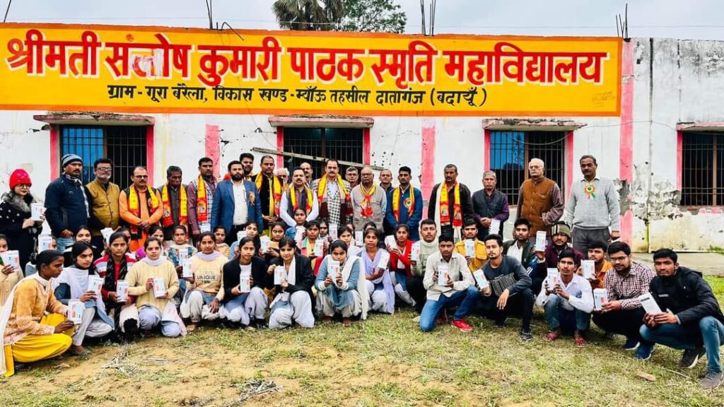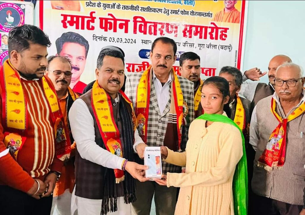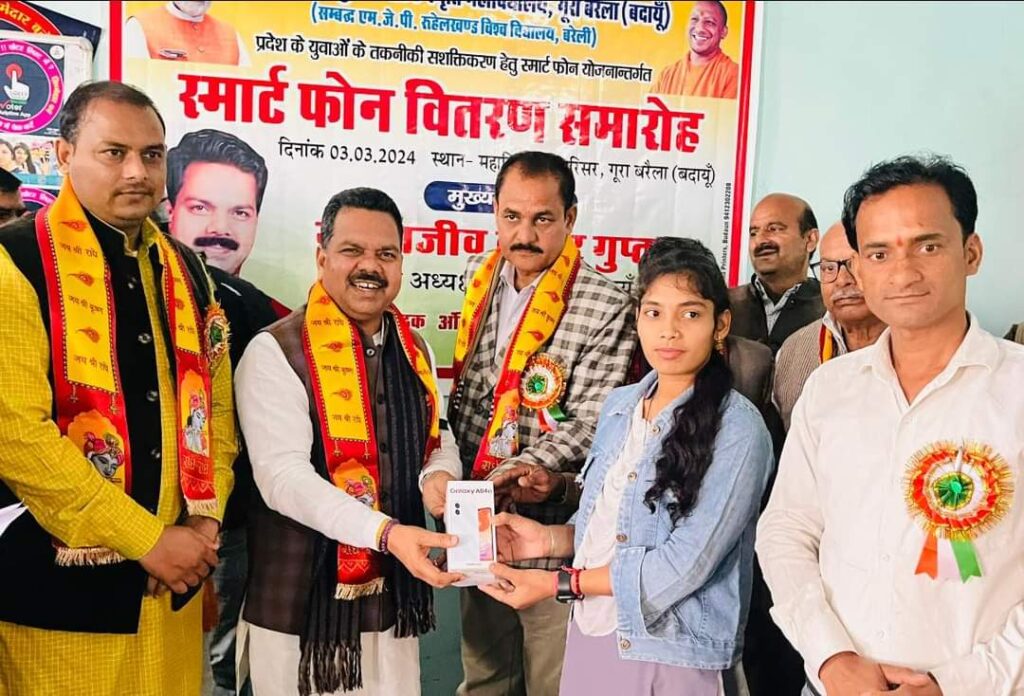 दातागंज। स्वामी विवेकानन्द युवा सशक्तिकरण योजना के अंतर्गत स्मार्ट फोन वितरण में मुख्य अतिथि के रूप में भाजपा जिलाध्यक्ष राजीव कुमार गुप्ता ने श्रीमती संतोष कुमारी पाठक स्मृति महाविद्यालय गूरा बरैला व पृथ्वीराज चौहान स्मारक जंग बहादुर सिंह कन्या महाविद्यालय चंगासी दातागंज में 51 व 80 छात्र व छात्राओं को स्मार्ट फोन वितरित किये। जिलाध्यक्ष राजीव कुमार गुप्ता ने कहा कि यह जो छात्र जीवन है