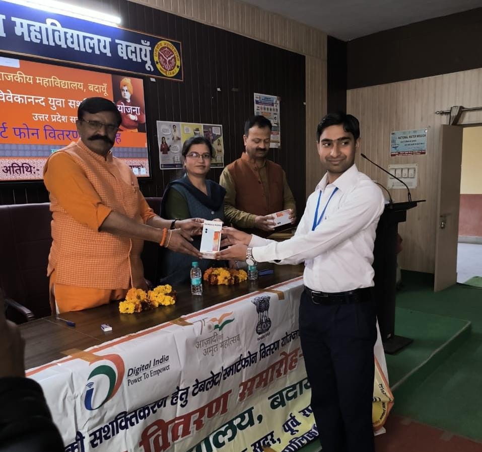 बदायूँ। आवास विकास स्थित राजकीय महाविद्यालय में बीए पंचम सेमेस्टर के कुल 339 छात्र छात्राओं को समारोह आयोजित कर स्मार्ट फोन वितरित किया गया। समारोह के मुख्य अतिथि सदर विधायक महेश चंद्र गुप्ता रहे। अध्यक्षता प्राचार्य डॉ श्रद्धा गुप्ता तथा संचालन राजनीति विज्ञान के विभागाध्यक्ष डॉ राकेश कुमार जायसवाल ने किया। उत्तर प्रदेश शासन द्वारा संचालित स्वामी विवेकानंद युवा तकनीकी सशक्तिकरण योजना के अन्तर्गत राजकीय महाविद्यालय में बीए अंतिम वर्ष के छात्र छात्राओं को स्मार्ट फोन प्रदान करने के बाद मुख्य अतिथि महेश चंद्र गुप्ता ने कहा कि उत्तर प्रदेश सरकार युवाओं को अथाह ज्ञान के सागर से जोड़कर भारत को विश्व गुरु बनाना चाहती है। उन्होंने कहा कि मनुष्य की सोच आवाज में बदलती है, और वह आवाज पूरे ब्रह्मांड में विद्यमान रहता है।अच्छी सोच से व्यक्ति अच्छा कार्य कर स्वयं का विकास करते हुए राष्ट्र का विकास करता है। अध्यक्षीय उद्बोधन में प्राचार्या डॉ श्रद्धा गुप्ता ने कहा कि विद्यार्थी स्मार्ट फोन का उपयोग अपने कैरियर को उच्चतम स्तर पर ले जाने के लिए करें तथा इसका दुरुपयोग ना होने पाए इसका ध्यान रखें।