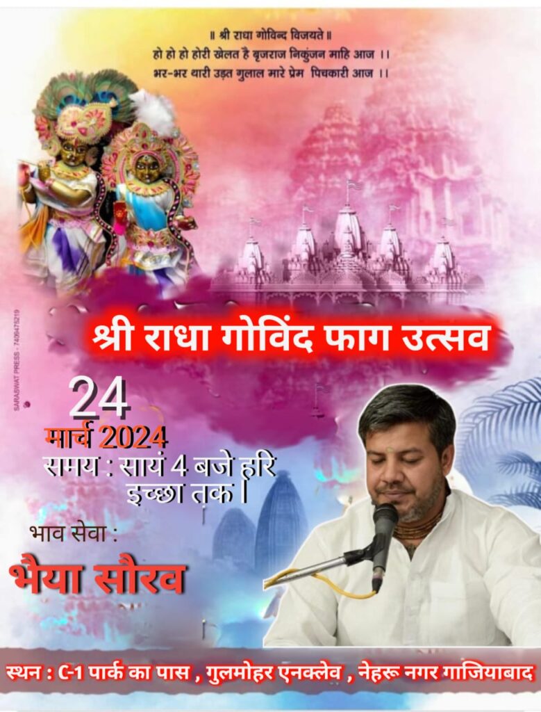 यहां आपको बता दे कि गुलमोहर एन्क्लेव में होली के अवसर पर यह आयोजन गत कई वर्षो से निरंतर हो रहा है। सोसाएटी के सभी निवासी वर्षों से हर वर्ष होली के उत्सव का आन्नद लेते है, उनके के लिए ही इस उत्सव की जबरदस्त तैयारी चल रही है। जिसके लिए इस बार दरबार विशेष रूप से सजाया जाएगा। उत्सव के मुख्य संयोजक राजेश अग्रवाल ने बताया कि उत्सव C-I पार्क के पास में होगा उत्सव में भजन गायक रसिक सौरभ भईया ( पिलखुवा), मनोज शास्त्री जी व अन्य रसिक जन विभिन्न विभिन्न क्षेत्रों से आ रहे है।