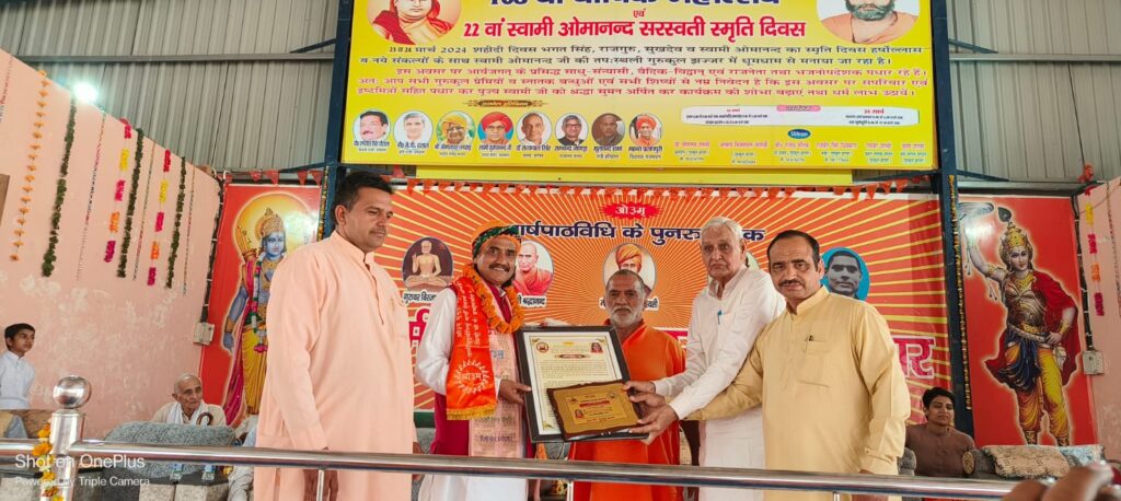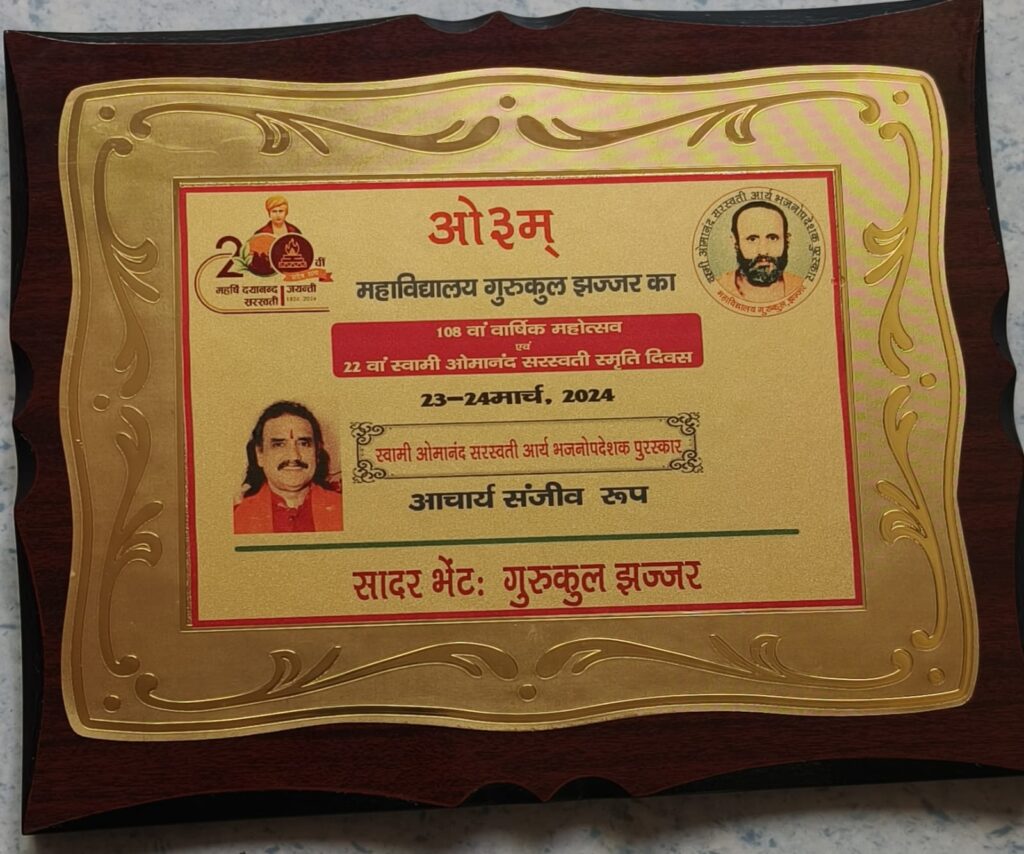 जनपद वासियों के लिए यह गौरव का विषय है ।आचार्य संजीव रूप ने बताया कि पिछले 32 वर्षों से निरंतर समाज सुधार,, वेद उपदेश,पर्यावरण के लिए निरंतर काम कर रहे कठोर व निरंतर पुरुषार्थ का परिणाम है यह पुरस्कार । कार्यक्रम में स्वामी संपूर्णानंद ,मेजर जनरल रणजीत सिंह, अनीता कुंडू ओएसडी सीएम हरियाणा,चौधरी रणजीत सिंह बिजली एवं जेल मंत्री हरियाणा,ओमप्रकाश धनखड़ राष्ट्रीय सचिव भाजपा,डॉ सुरेंद्र डीन एमडीयू,महाविद्यालय के प्राचार्य आचार्य विजय पाल एवं गणमान्य उपस्थित रहे! आचार्य संजीव रूप को सभी आर्य समाजियों, ग्राम वासियों तथा क्षेत्रवासियों ने शुभकामनाएं दी ।