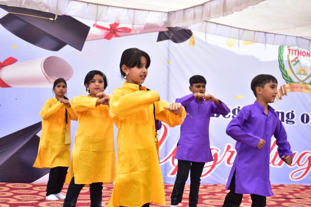 बदायूँ। टिथोनस इंटरनेशनल स्कूल,में किंडरगार्टन अपग्रेडिंग सेरेमनी का आयोजन किया गया, जिसमें प्री नर्सरी से कक्षा दो तक के छात्र छात्राओं ने विभिन्न सांस्कृतिक कार्यक्रमों में उत्साह से भाग लियाI दीप प्रज्जवलन तथा सरस्वती वंदना के बाद बच्चों ने मनमोहक प्रस्तुतियाँ दींI मुख्य अतिथियों ने प्री- प्राइमरी विंग को छोड़ प्राइमरी विंग में प्रवेश कर रहे केजी के विद्यार्थियों को कन्वोकेशन ड्रेस में सर्टिफिकट देकर सम्मानित किया।