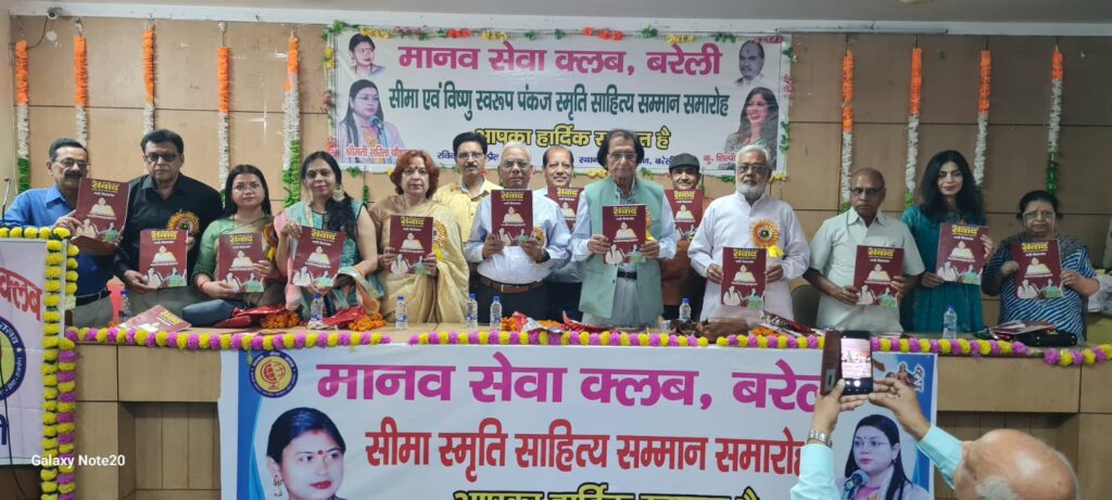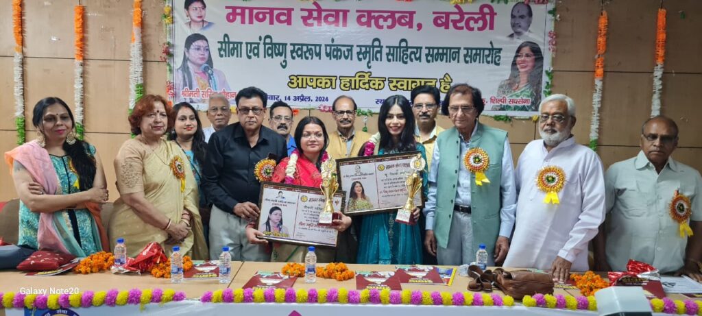 बरेली। मानव सेवा क्लब के तत्वावधान में सीमा विष्णु स्वरूप पंकज स्मृति साहित्य सम्मान समारोह में बदायूं की प्रतिष्ठित कवयित्री सरिता चौहान को 27 वां सीमा स्मृति साहित्य सम्मान तथा बरेली की कवयित्री शिल्पी सक्सेना को छठा विष्णु स्वरूप पंकज स्मृति साहित्य सम्मान दिया गया। सम्मान स्वरूप हार, शाल, प्रशस्ति-पत्र,स्मृति चिन्ह कार्यक्रम के अतिविशिष्ट अतिथि शायर प्रो. वसीम बरेलवी, कार्यक्रम अध्यक्ष डॉ. शशि बाला राठी, मुख्य अतिथि प्रो. राजेन्द्र भारती, विशिष्ट अतिथि रमेश गौतम, डॉ. कविता अरोरा, पूर्व मेयर सुभाष पटेल तथा क्लब के अध्यक्ष सुरेन्द्र बीनू सिन्हा ने सम्मानित किया। रोटरी भवन में हुए कार्यक्रम में “विविध संवाद” के नारी विशेषांक का विमोचन अतिथियों द्वारा किया गया।