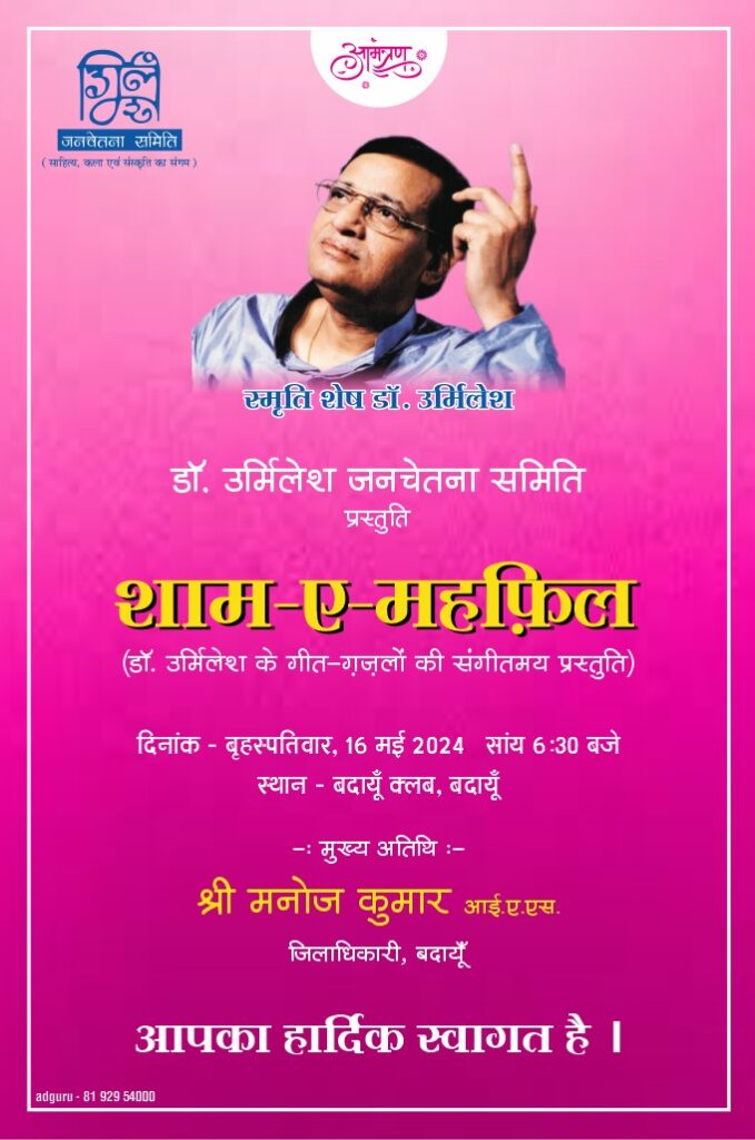 बदायूं। गौरव राष्ट्रिय कवि एवं गीतकार डॉ. उर्मिलेश की 19वी पुण्यतिथि पर डॉ. उर्मिलेश जनचेतना समिति की ओर से संगीत संध्या का आयोजन कल शाम 6 बजे बदायूं क्लब में किया जायेगा। कार्यक्रम में प्रतिभाशाली संगीत कलाकार अपने सुरों से डॉ. उर्मिलेश की लिखे गीतों एवं ग़ज़लों को संगीत के साथ प्रस्तुत कर उन्हें याद करेंगे। समिति के सचिव एवं डॉ. उर्मिलेश के पुत्र डॉ. अक्षत अशेष ने बताया की प्रति वर्ष की भाति इस वर्ष भीडॉ. उर्मिलेश की स्मृति में यह आयोजन किया जा रहा है जिसमे मुख्य अतिथि जिलाधिकारी मनोज कुमार एवं अन्य जनपद स्तरीय अधिकारी गण रहेंगे। कार्यक्रम में नगर साहित्यकार, समाजसेवी आदि लोगों को भी आमंत्रित किया गया है।