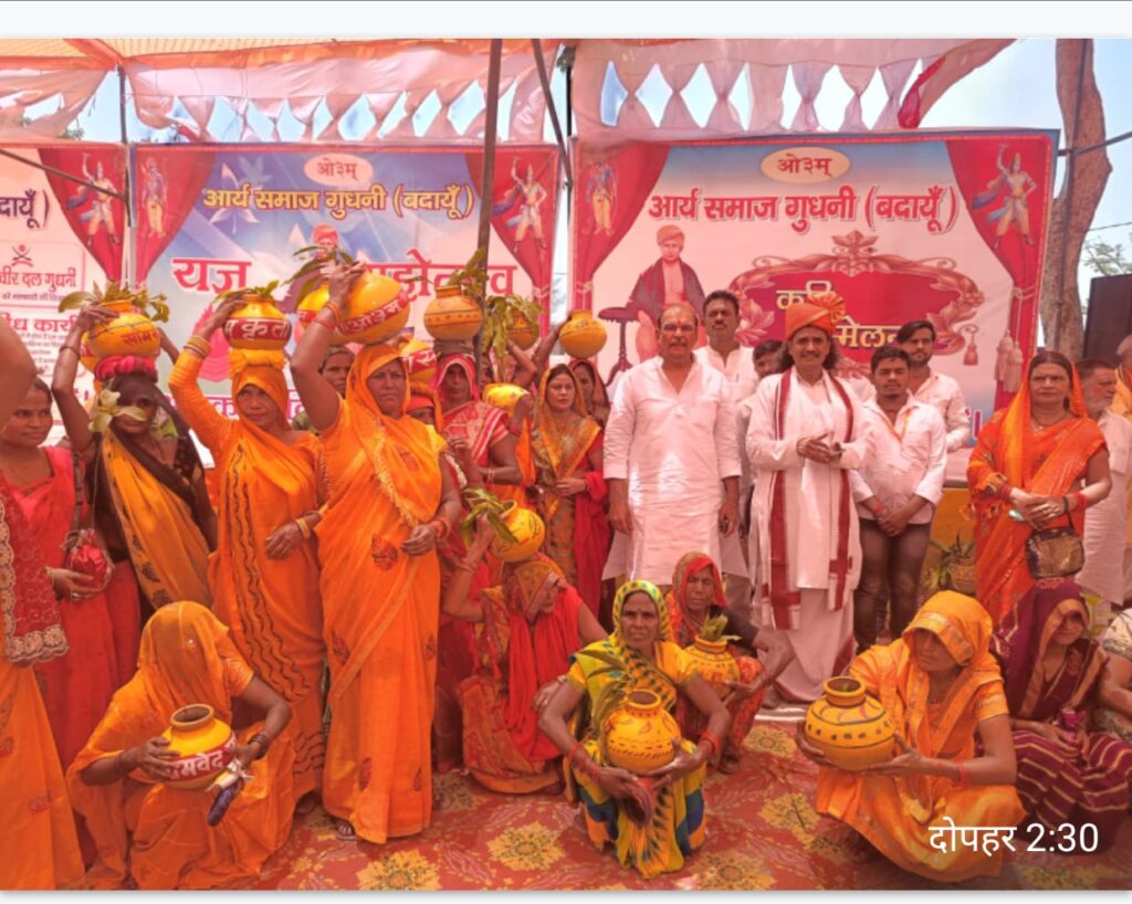 बदायूँ। की बिल्सी तहसील क्षेत्र के यज्ञतीर्थ गूधनी में आर्य समाज के 110 वें वर्षिक उत्सव के अवसर पर आयोजित यज्ञ महोत्सव 2024 का शुभारंभ भव्य शोभा यात्रा के साथ हुआ । भव्य यज्ञ स्थल पर एकत्रित 500 से अधिक महिलाओं बेटियों आदि को मुख्य अतिथि पूर्व मंत्री डीपी यादव एवं उप जिलाधिकारी बिल्सी प्रवर्धन शर्मा ने वृक्ष दिए । आर्य समाज हर वर्ष 500 वृक्ष घर-घर में लगवाता है । अंतर्राष्ट्रीय वैदिक विद्वान आचार्य संजीव रूप के निर्देशन में होने वाले इस महोत्सव में लगभग 1000 लोगों ने भाग लिया।